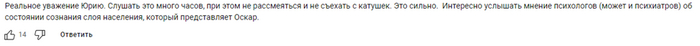 Интересно еще и то, что про Кучеру я (да и не только я) уже давно мало что слышал. Последнее, что помню – это, наверное, его роль в стопицотом сезоне разбитых фонарей. И услышал примерно за пару-тройку недель до просмотра ролика. То есть я прочитал в телеге пару его комментариев: по поводу актера Назарова, еще что-то… Комментарии я оценил положительно и сложил мнение об Оскаре как о стороннике СВО и т.д., но не более. И тут…его как этого самого сторонника…зовут…к Дудю...(пауза). Причем это сторонничество прям выведено в заголовок: «Разговор с тем, кто поддерживает армию России». Уже это наводит на нехорошие мысли… Вот неужели это главное достижение в жизни и карьере Оскара Кучеры? Или может единственное достижение? Или он на этом поприще достиг каких-то космических высот? Или это единственное, на что он способен и к чему пригоден, раз это выводится прям в заголовок? Или может это такая редкость и невидаль нынче - что есть такие люди? Просто с такой подачей это все выглядит как разговор с говорящей обезьяной, простите. Паскудный душок уже самого старта начинает витать, короче говоря.