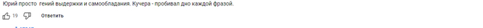 Поясню. Гости у Юрия обычно ему под стать, и транслируют близкую ему позицию, ну а те, что выбиваются из этой череды, те подвергаются большему или меньшему прессингу, с целю вывода на «чистую воду». Получается обычно слабо, что немудрено, т.к. сабж сильно зациклен, его мало интересуют другая точка зрения, да и нет у него задачи ее показать (чтоб он там не вещал). Ну и когда после Полозковой с её Бейонсе и Рианной (рукалицо), Серебренникова, Noize MC, Парфенова, каких-то нелепых обличителей пропаганды, которые все дудят (да) в одну дуду, вдруг…Кучера.