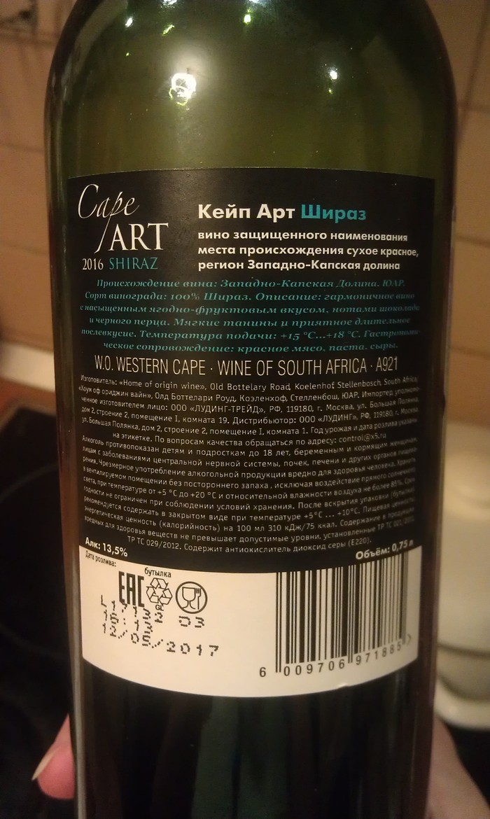 Добрый день! Сегодня купили данное вино Кейп Арт Шираз красное в пятерочке , после вскрытия при разливе услышали звук в бутылке. Перелили на дне оказался осколок стекла внушительно размера плюс мелкие стеклышки. Будьте осторожны, проверяйте не только этикетки, но и посторонние шумы. Написали письмо претензию на указанный адрес на бутылке. Куда можно еще разместить опасную информацию?