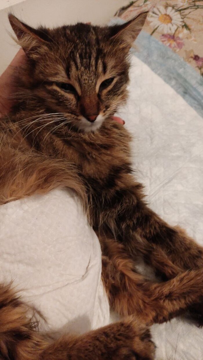 Кошку привезли в плохом состоянии: травма позвоночника, ЧМТ, она не ела, с трудом опиралась на передние лапы, не могла сфокусировать взгляд, плакала от боли и страха.