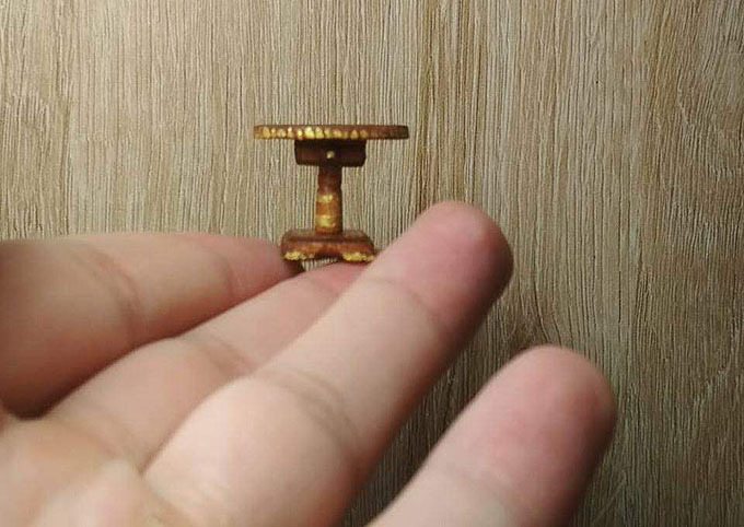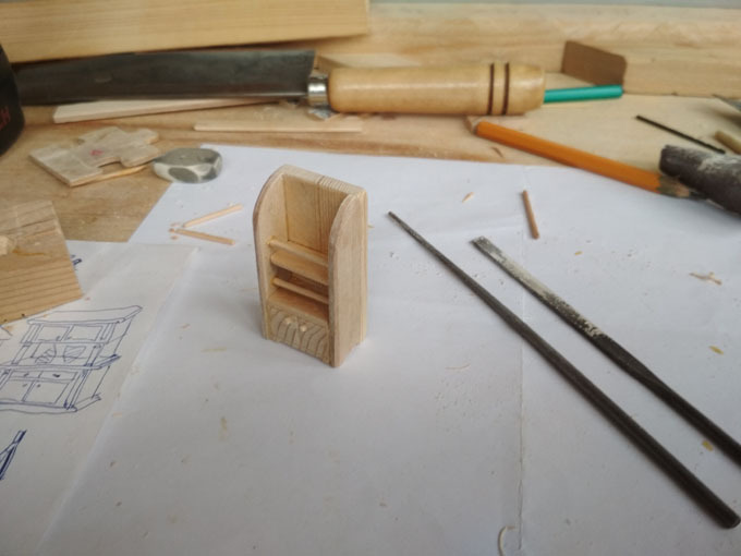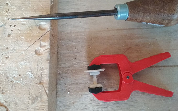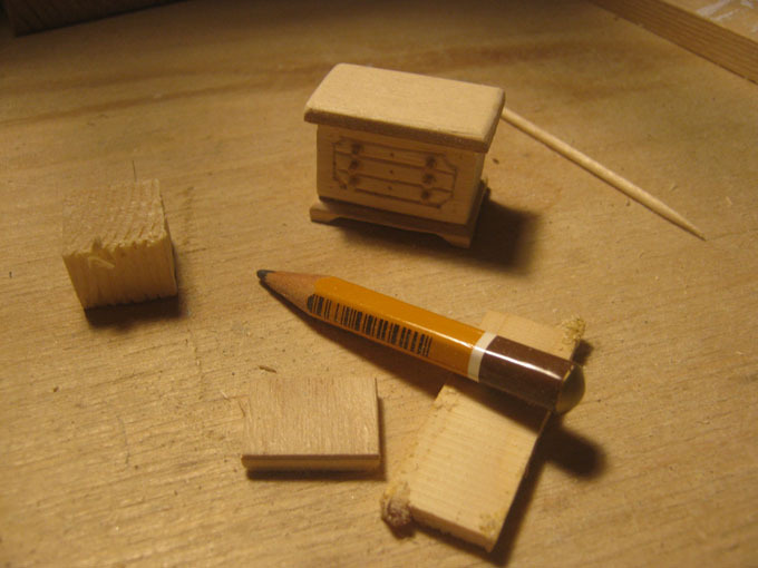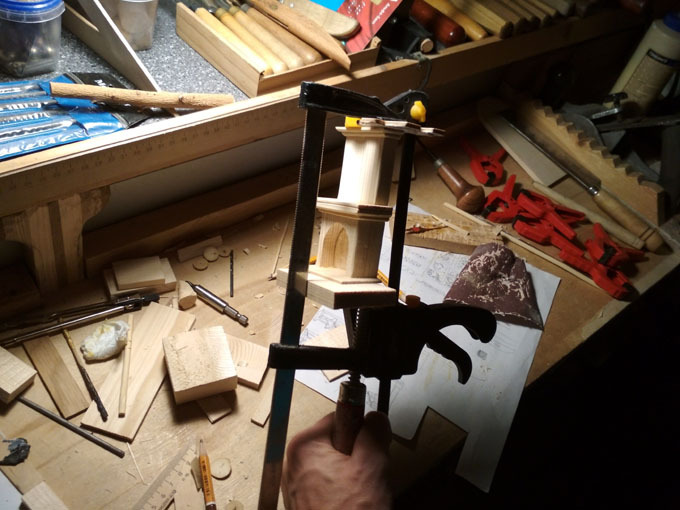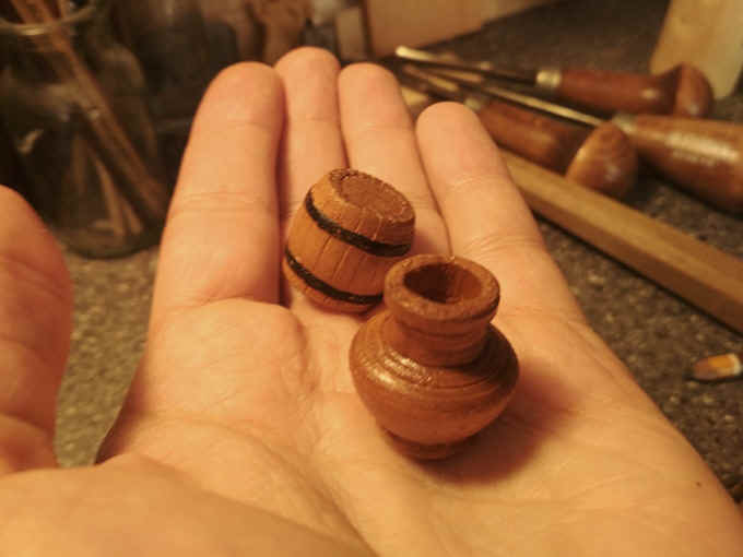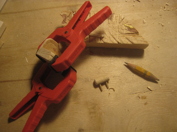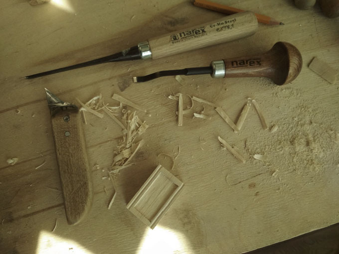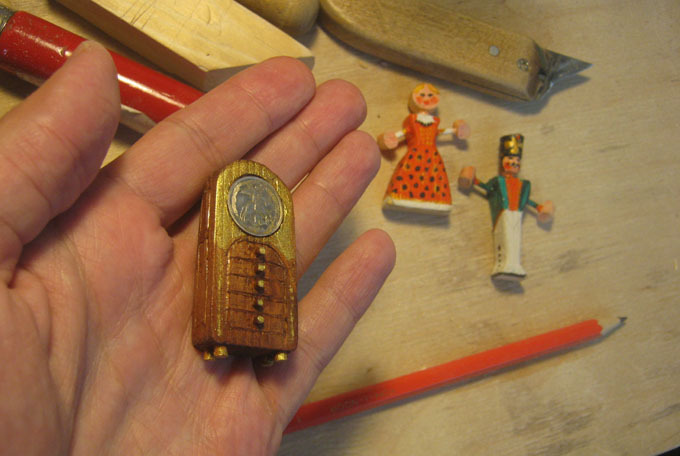 Достал срез ветки от какого-то мягкого дерева, типа ивняка, срезанного еще при санитарных рубках в нашем лесу. Для серьезных изделий этот ивняк совершенно не годился, древесина мягкая, а сердцевину шилом можно было проткнуть не напрягаясь. Зато как она замечательно пригодилась в качестве елок у домика! Во мне запел ландшафтный дизайнер, выточил на станке четыре елочки, без шлифовки, мохровистость древесины очень хорошо походила на еловый лапник.