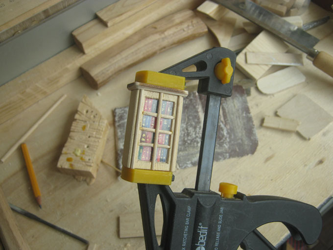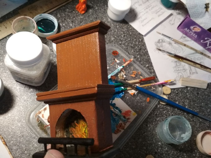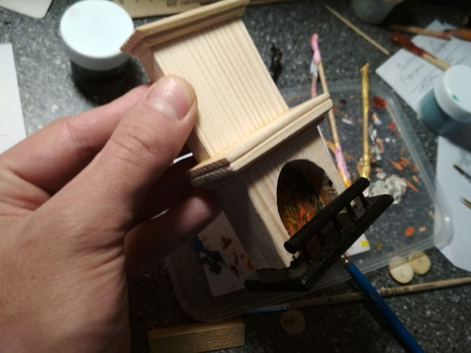 Домик в целом получился сомасштабен Сашиному кукольному домику. Мансардные окошки. Уже заранее догадвался, как будет привлекательно оттуда светить огонек.