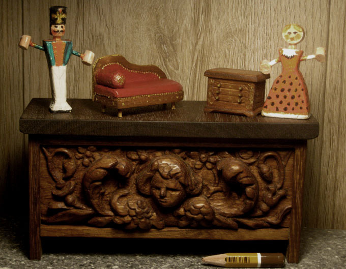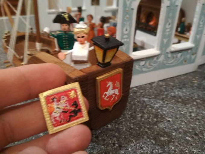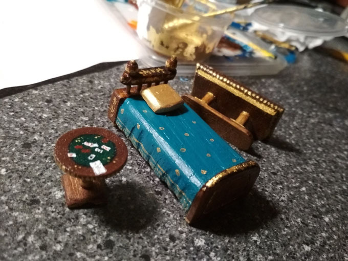 Дед Мороз и Снегурочка из Сашиного домика с радостью переехали в новое жилище. Сделал лавочку и навалил кучу подарков! Заборчик справил из бамбуковых палочек. Закрыл вторым слоем акрила, позолотил ручку двери, вот и все!