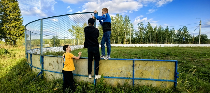Мы с хоккеистами, дядей Толей на тракторе и Женей за 3 часа раскрутили хоккейный корт, демонтировали и перевезли на наше место у скейтпарка. Там он будет меньше, но мы трезво оцениваем возможности по заливке, расчистке ну и что придумывать, места там немного и есть. Скорость демонтажа и количество ребят порадовали.