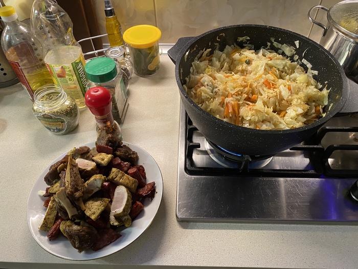 Затем берём равными частями квашеную и сырую капусту. Сначала минут 10-15 обжариваем квашеную, добавляем сырую, тушим всё вместе до полуготовности.