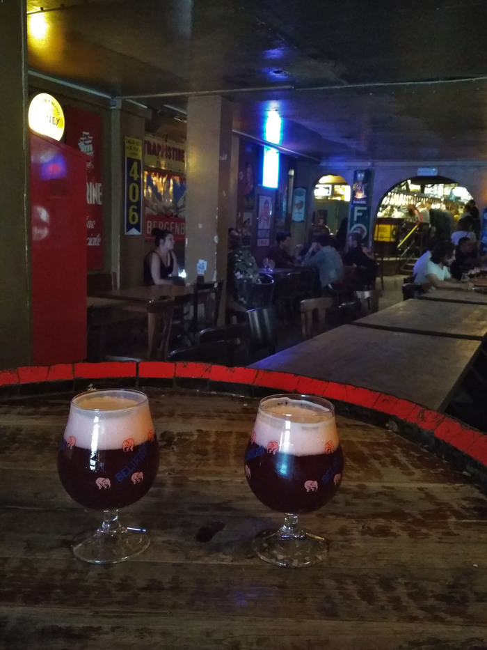Знаменитый бар Делириум. Пиво почему-то отличается по вкусу от того, что продают у нас. Наливают с горкой, потом споласкивают стакан снаружи и выдают мокрый. Прикольно.