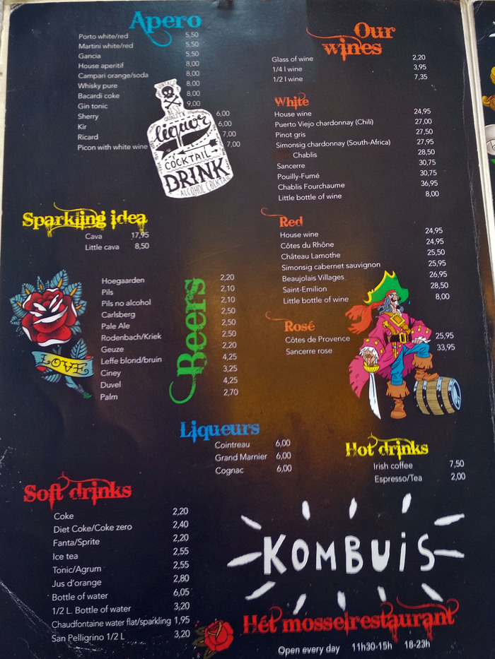 Меню заведения. Не выбирали, зашли в случайное, не выглядящее пафосным. Мы взяли "garlic cream & wine mussels". Персонал не понимал по английски, мы успели испугаться и выйти на улицу - за нами вышла официантка и уговорить вернуться. Чувствуется, что клиенты нужны)