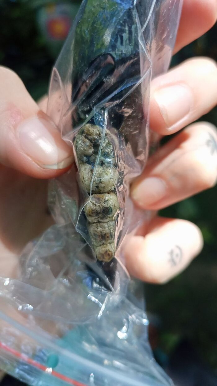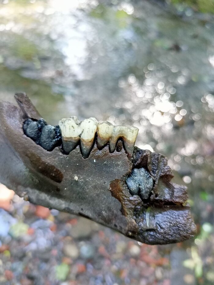 Предположил что это кусок кобаньей челюсти (11-18 месяцев от роду). Что можете сказать по этому поводу? Зубы всеядного существа. Большие коренные как у человека, премоляры как у хищных животных.