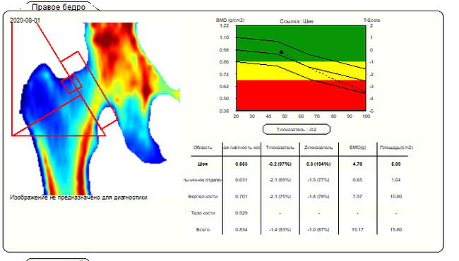 Вот такие красивые снимки я получаю, там где красный цвет более плотная ткань, а где синяя менее плотная. Но нам важен лишь Т-критерий (если простым языком то это сравнение плотности костей пациента с средней плотностью здорового человека 25-27 лет). Если Т критерий ниже -2,5 то выставляется диагноз остеопороз