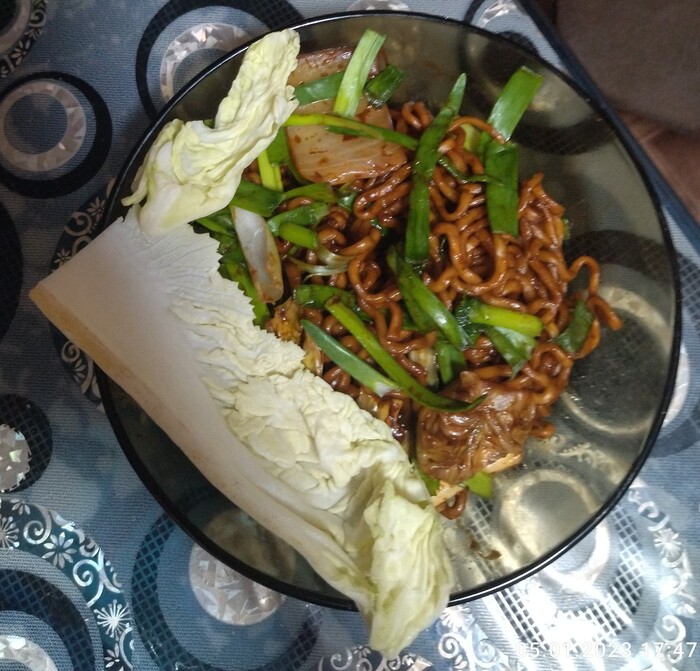 Лапша толстая, пшеничная. Соус темнее обычного, овощей не слишком много. Осталось ждать, пока лапша сварится, я решил добавить к ней овощей-пекинской капусты и лука.