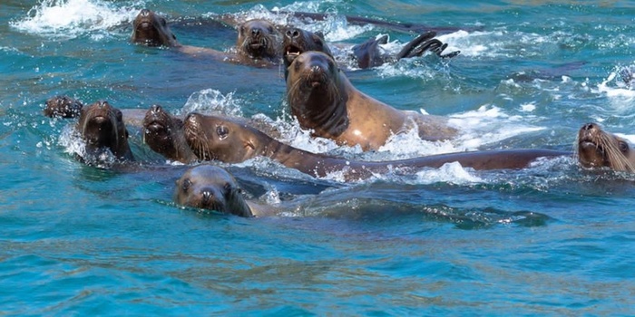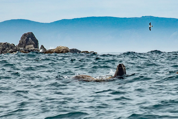 Эти группы лихих пловцов в полосатых купальниках и дерзких молодых львов рвались на встречу новым приключениям. В это время на ближней скале играли в "царя горы", а заинтересовавшийся нашим надувным каяком лев-одиночка ушёл гонять чаек и забирать у них честно наловленную рыбу.