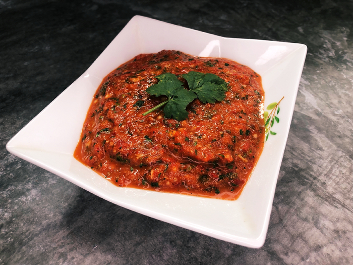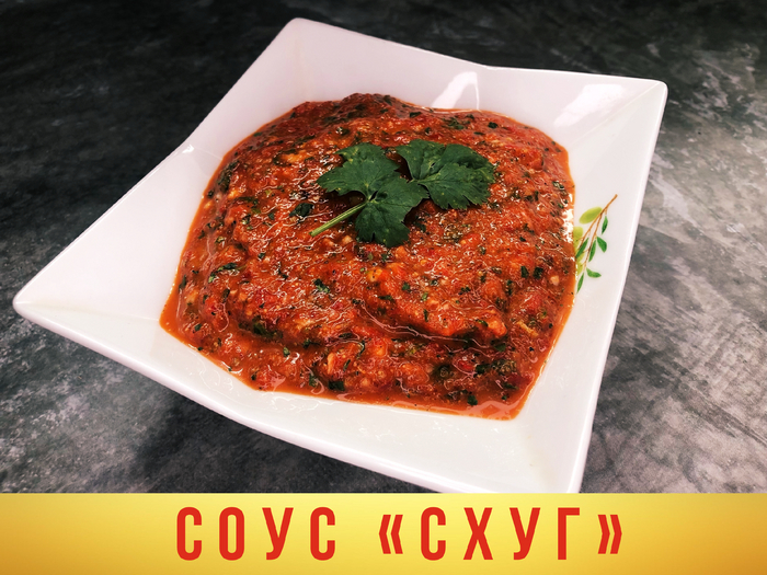 Итак, схуг, он же Йеменская аджика. Невероятно острый, пряный соус, подается как к мясным блюдам, так и к несолёным белым сырам, овощам, к хумусу или же, особо смелые, могут есть его просто так, в виде бутерброда.