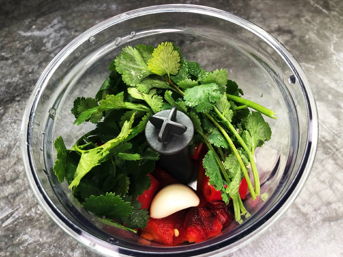 Отрываем плодоножку перцу чили, сожженному болгарскому перцу, очищаем чеснок, все это засыпаем в чащу блендера.