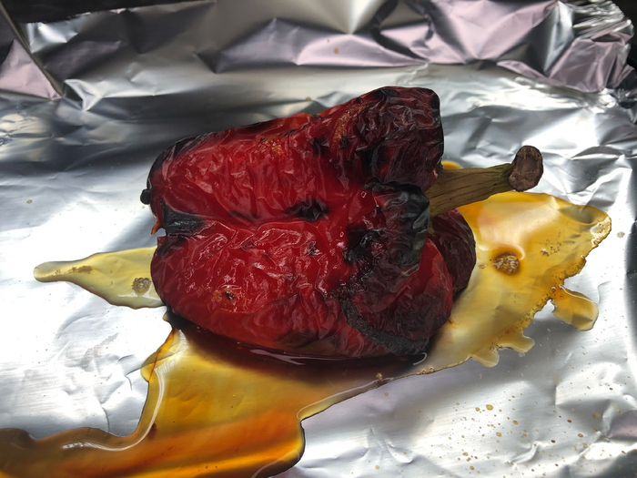 Первым делом надо сжечь сладкий перец. Сделать это на газовой плите можно куда быстрее и эффективнее, но я буду страдать с электрической духовкой, потому, что выйдет то выйдет.