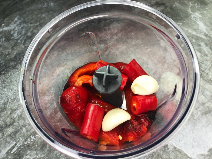 Болгарский перец, чили и лук режем крупно и запекаем в духовке минут 40 при 180 градусах. Затем, добавьте в чашу блендера чеснок, петрушку, уксус, лимонную цедру и сок, копченую паприку. Посыпьте солью с перцем. Сверху оливковое масло и уксус и овощи из духовки. По рецепту полагается еще класть свежий чили, но тут смотрите сами 🌶