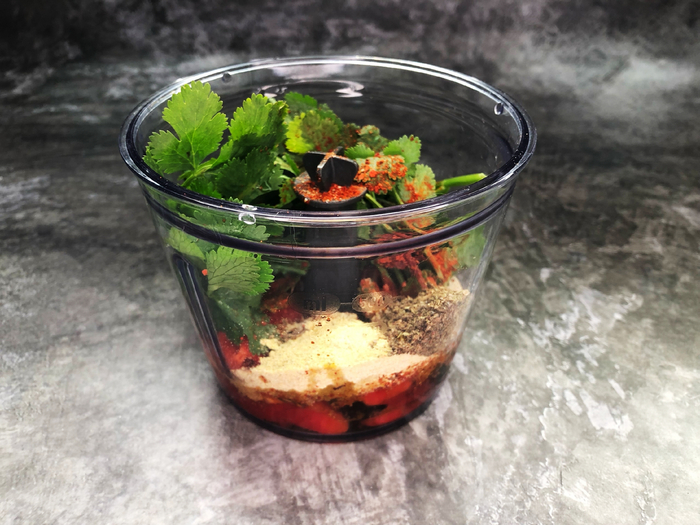 Отправляем в чашу все специи: кайенский перец, молотый хильба, паприку, семена кориандра, кардамон, кумин (в этот раз можно обойтись без него, если прям не нравится), черный молотый перец, немного соли.
