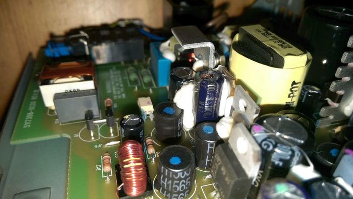 6.3 вольта, 1800 микрофарад. Хоть и Rubycon - но никто не вечен. Нашел замену с номиналом 40 вольт и 2200 микрофарад. Пойдет, наверное: больше-то не меньше. С трудом выковырял дохлый (надо резать силастик, которым производитель щедро скрепляет все компоненты от вибраций, и аккуратно чтоб соседей не сковырнуть). Заменный конденсатор сильно больше размером и на то же место не лезет, пришлось подпаять удлинительные проводки, а сам кондер я приклеил термоклеем к свободному месту на плате. Фоткать эту порнографию, уж извините, не стал.