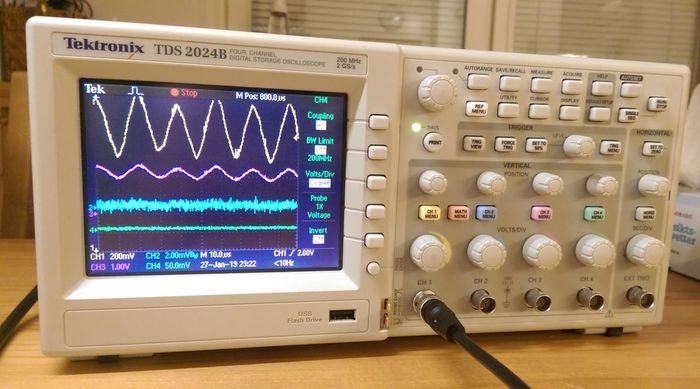 На днях заглядываю - а там четырехканальный цифровой осциллоскоп (или осциллограф? Как правильно и в чем разница - я хз) Tektronix TDS2024B. Ничего сверхестественного, просто отличная рабочая лошадка на 200 МГц - но тем не менее. Такой даже секонд-хенд сильно больше килобакса стоит.