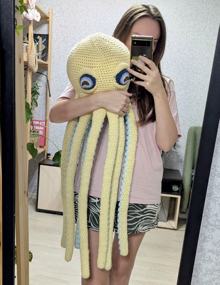 Я давно вязала этого чудилу и он долго лежал в гардеробной. Одно время я их так много вязала, что расхотела повторять. И до сих пор не хочу) Так как тут 400 присосок, которые вяжутся отдельно и я честно говоря задолбалась.