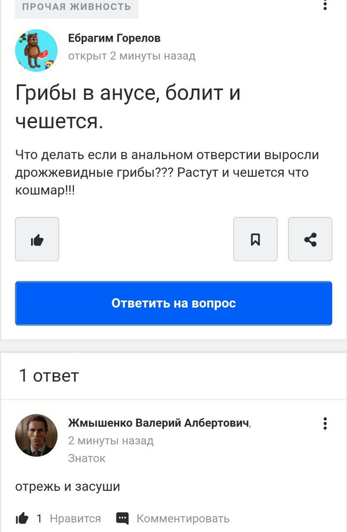 На следующем скрине мы видим настоящего кулинара, который захотел помочь обычным пользователям ответов маил ру в процессе приготовления жопных грибочков