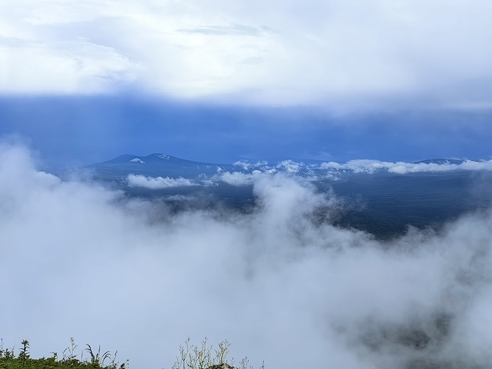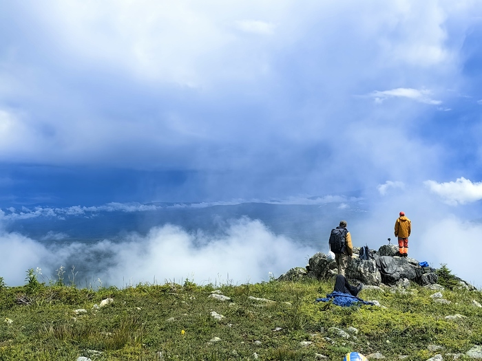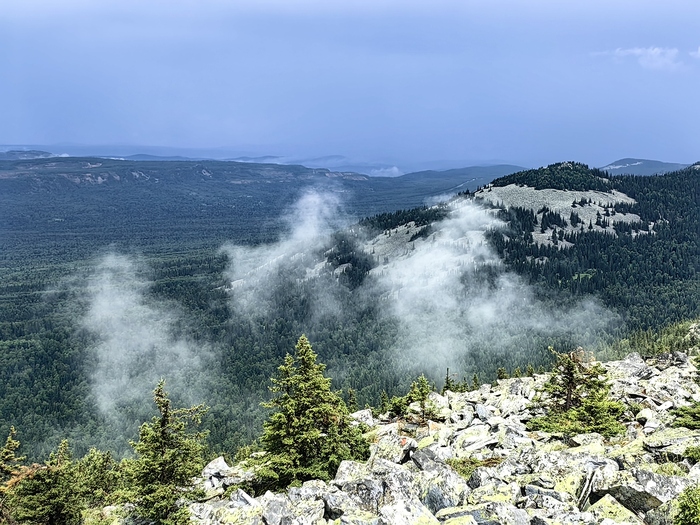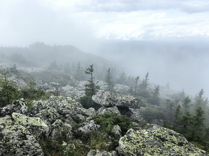 На уровне облаков. Поднимаемся в дождь очень осторожно, несколько человек упало, хорошо что без последствий. Курум это здорово, но если он мокрый - травмоопасный возрастает многократно.