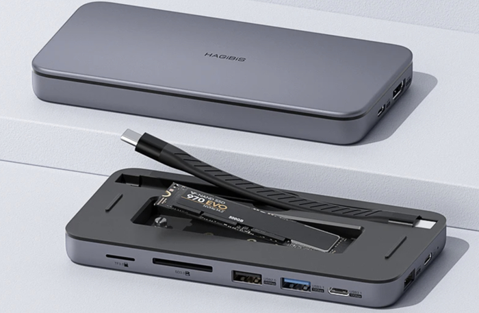 Hagibis 9 в 1 — док-станция нового поколения, объединяющая функции расширения портов и хранения данных. Помимо стандартных разъёмов USB-A, HDMI, Type-C и слота для карт памяти, устройство оборудовано отсеком для SSD-диска, который превращает хаб в полноценный накопитель.