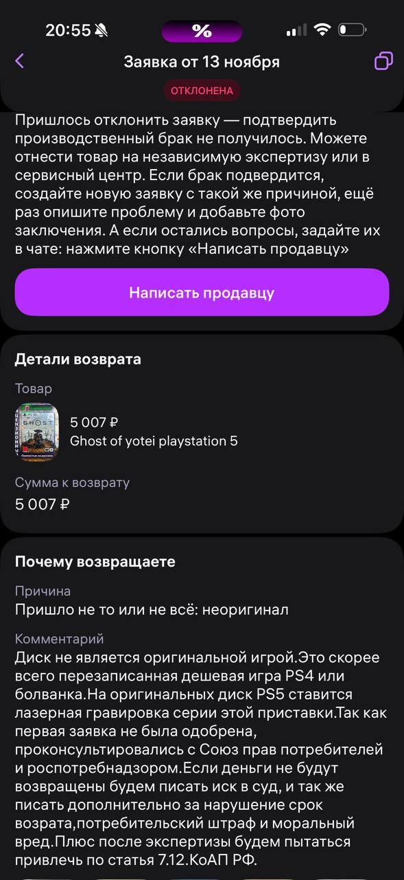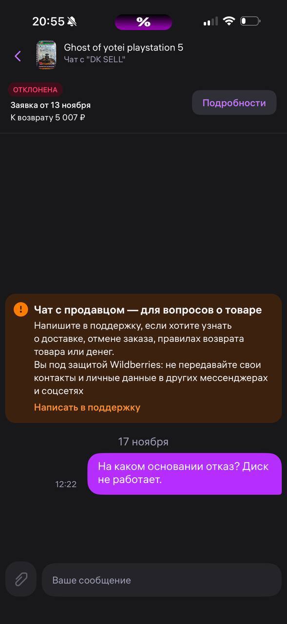 Что же делать? Что же делать? Думал я. Решено было конечно же вернуть диск. Описав проблему... я вдруг получаю отказ. Открыв спор и описав ситуацию специалистам( а специалистам ли?) @Wildberries, получил..... Отказ!