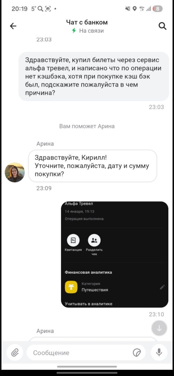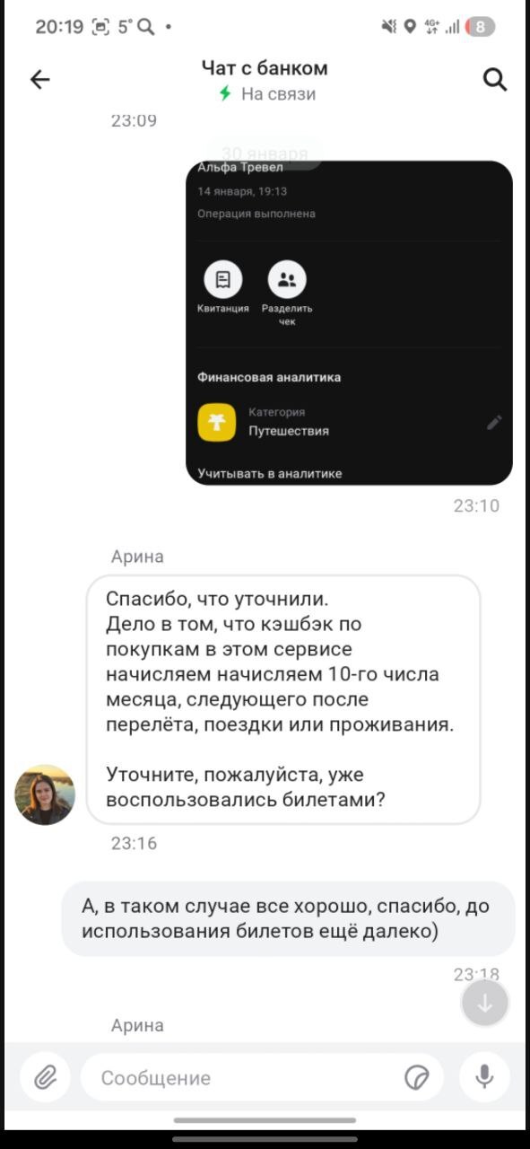 При повторном обращении в поддержку выяснилась неожиданная деталь. Оказывается, с 1 марта 2025 года банк в одностороннем порядке изменил условия начисления кэшбэка в сервисе Alfa Travel: теперь бонусы начисляются уже после покупки, 10-го числа месяца, следующего за покупкой, а не после самой поездки. Об этом писали на сервисе banki.ru. Но меня как клиента об этом явно не уведомили – ни письмом, ни пуш-уведомлением, ни каким-либо сообщением в приложении. В результате я попал в своеобразный «переходный период»: купил билеты по старым правилам (ожидая выплату после путешествия), а правила успели поменяться. Получается, мою операцию не покрыли ни старые условия (потому что на момент перелёта программа уже работала по-новому), ни новые (потому что на момент покупки действовали старые правила и кэшбэк сразу не начислили). Банк фактически оставил меня ни с чем из-за изменения правил без предупреждения, и это вызывает закономерное возмущение.