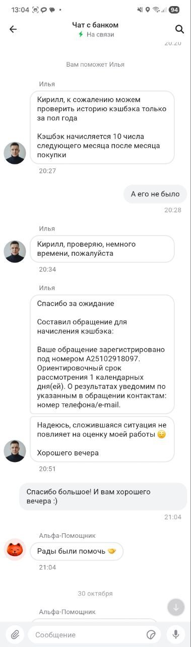 При описании ситуации и просьбы вернуть положенные 10% кешбека изначально был получен отказ