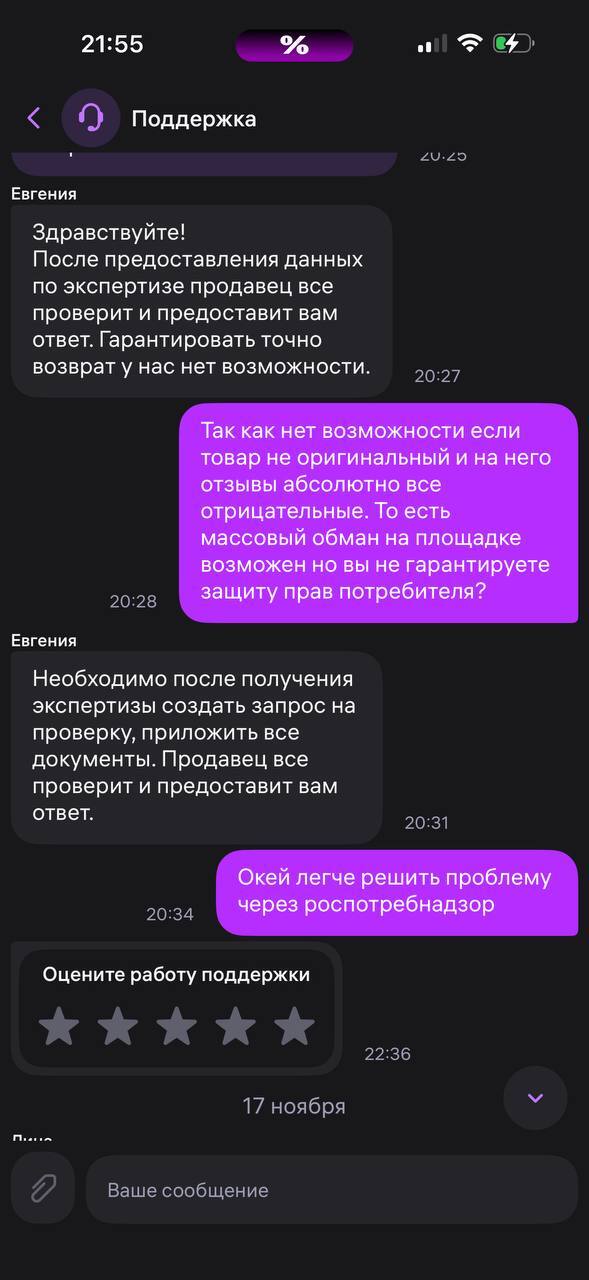 Решив что может специалисты просто устали, написал напрямую в поддержку. И... Делайте экспертизу, НО: "ПРОДАВЕЦ ПРОВЕРИТ И ПРЕДОСТАВИТ ВАМ ОТВЕТ. ГАРАНТИРОВАТЬ ТОЧНО ВОЗВРАТ У НАС НЕТ ВОЗМОЖНОСТИ"