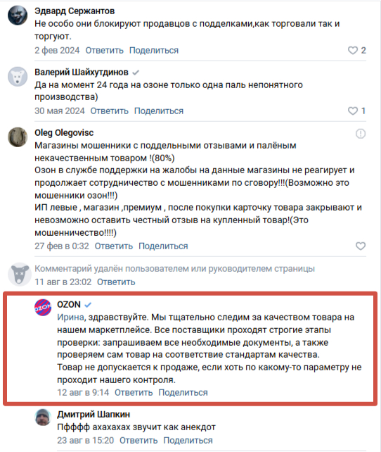 Комментарии, конечно, быстро заполонила волна возмущения. Люди пишут: «Как была подделка, так и осталась». И тут появляется официальный представитель Ozon, пытается убедить всех, что они «очень тщательно следят за качеством»…