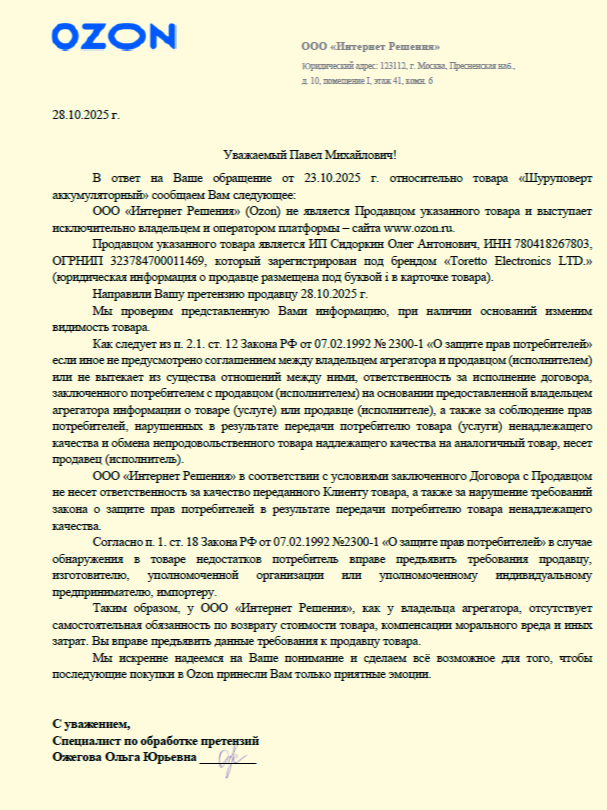 Может кто подсказать, как грамотно составить досудебку по данному вопросу? Ну а потом и исковое, видимо, потому что озону плевать, оператор на жалобу сделал отписку стандартную и тут же завершил диалог.
