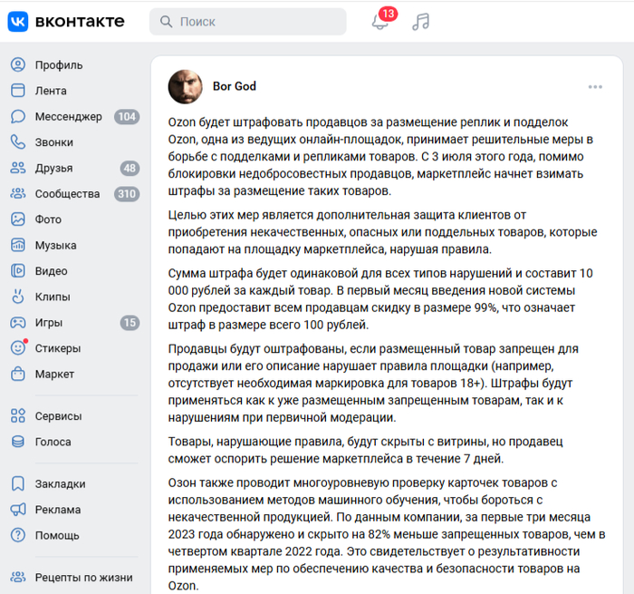 На одной из страниц ВКонтакте кто-то выложил пресс-релиз Ozon о борьбе с контрафактом: мол, будут блокировать недобросовестных продавцов, штрафовать по 10 тысяч за каждый товар, проводят многоуровневую проверку и вообще следят за качеством товаров.