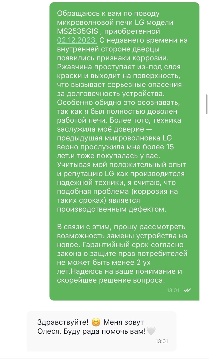 Я — приверженец техники LG. Моя предыдущая микроволновка от этого бренда куплена в «Эльдорадо или М-Видео» и была настоящим трудягой: она верно служила мне более 15 лет. Естественно, когда в декабре 2023 года потребовалась новая, я не раздумывая взял ту же марку и в том же магазине. Модель LG MS2535GIS. Всё было прекрасно, пока несколько месяцев назад я не заметил на внутренней стороне дверцы странные пятна. При ближайшем рассмотрении оказалось, что это ржавчина, которая проступает ИЗ-ПОД СЛОЯ КРАСКИ.Для микроволновки, которой нет и двух лет, и которая не подвергалась экстремальным условиям (стоит на кухне, а не в парилке) — это не нормально. Я уверен, что это производственный брак: нарушена технология грунтовки или покраски металла.