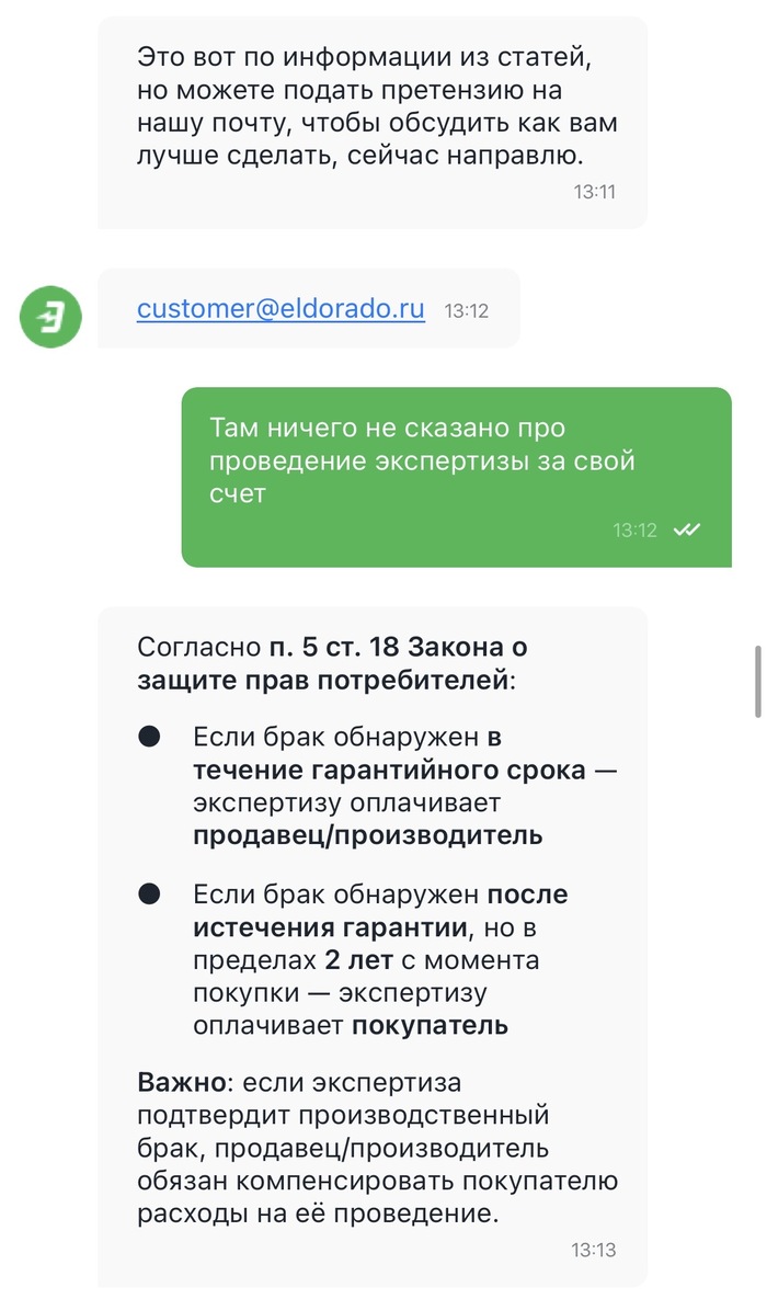 Начались мытарства. Я написал в чат поддержки «Эльдорадо». Первая реакция — отфутболили: «Гарантия 1 год истекла, платите за экспертизу сами».