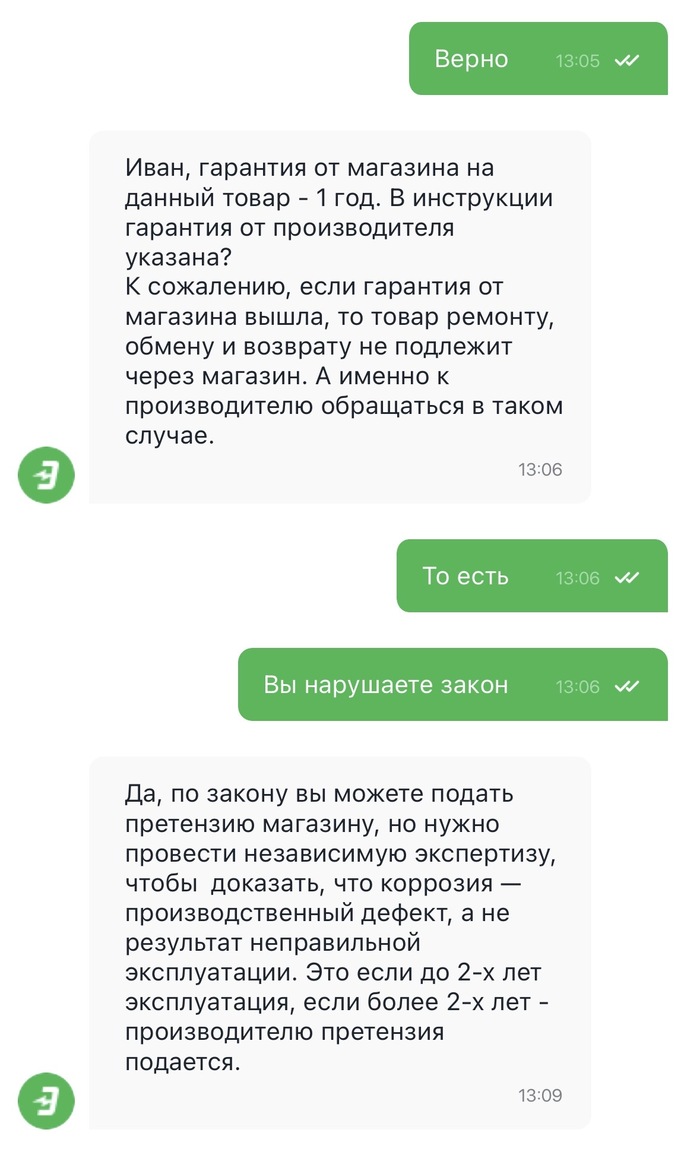 1. «Сначала должны были дать нам проверить». А зачем? Они же в чате сразу сказали: «гарантия кончилась, идите к эксперту». Я им просто поверил и сделал так, как они сказали! Это ловушка: с одной стороны, говорят "идите к эксперту", с другой — "а мы вам экспертизу не оплатим, потому что вы сами пошли".