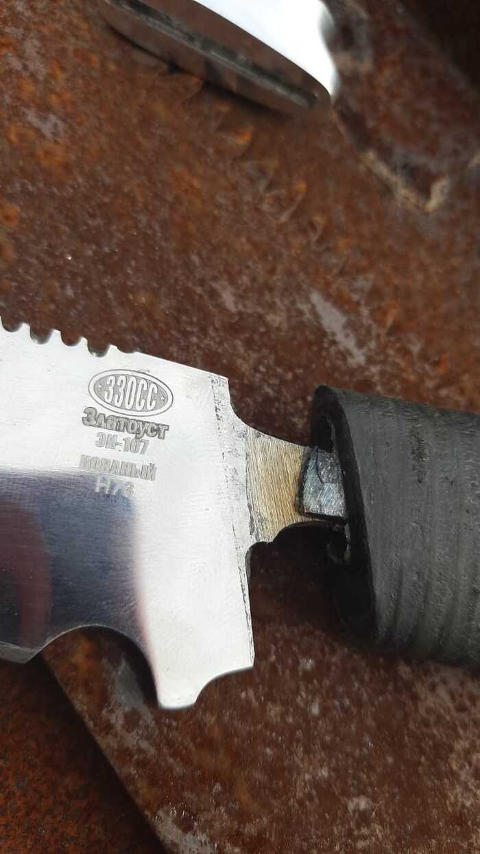 И вот в один день он устал, сказал - "я усе". Фотки ниже - где именно он устал. Разобрался так сказать в руках) Ну я в печаль и горе, уже стал думать как курочить рукоятку, чтобы подварить (никогда не варил) и тут вспоминаю, что слышал где то про гарантию 10 лет на свои ножи у этого завода. Порыскаль в инете - и правда.