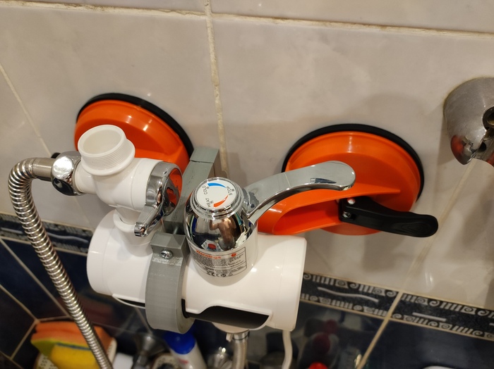 Изначальная задумка - в качестве подарка приятелю для повышение комфортности бытия в съемной квартире.Был приобретен на маркетплейсе самый дешевый проточник с выходом на гусак и душ, мощностью 3 кВт. За 1200 рублей. Так как мы топим за безопасность, а УЗО в щитке нет, приобрел на маркетплейсе "провод для водонагревателя" на 1,5мм2 с УЗО (УЗО без заземления работает! пусть и не так эффективно), провод лучше припаять, отрезав родной, хотя и на родном нормально работает. Так как девайс рассчитан на установку в отверстие типичной раковины, а нам надо универсально и готовность включить "хоть щас", на том же маркетплейсе взял вакуумную ручку для переноски стеклопакетов и распечатал крепление к нему на 3д принтере (можно обойтись и изолентой с подкладками). Всё, теперь можно цеплять девайс к стене облицованной плиткой. Не забываем, что при установке нудно соблюдать горизонтали и вертикали (касается и изделий более именитых брендов, на них это написано. На этом написано мелко и по английски, что и привело к небольшой аварии.
