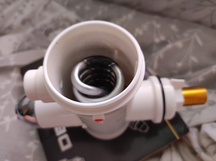 У этой модели штуцера пластиковые, рассчитанные на подключение гибких подводок. Что располагает к установке под мойку в кухне, аналогично маленькому накопительному. Мотать на них уплотнительную нить и накручивать металлическую муфту - так себе. Но реализовать у меня было удобнее так. Подразумевалось соединить непосредственно с краном холодной воды, но розетка помешала. Цена этого нагревателя около 2600 рублей.