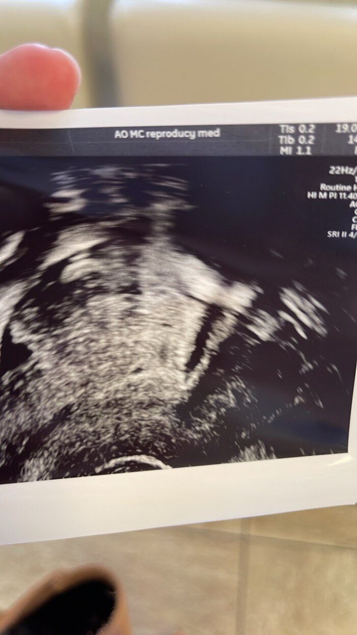Так как на перенос я приехала без мужа — он был в командировке, а через пару дней после переноса мне лететь на тренинг в Алматы — мы не виделись неделю. Поэтому «первая фотография» перенесённого эмбриона оказалась кстати.