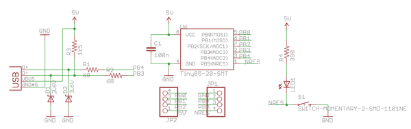 Схема платы показана ниже, схема крепится к контакту сброса, PB5 который расположен справа.
