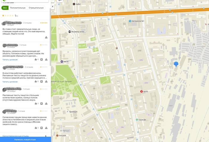 Вышел здесь очень интересный пост (В Челябинске уничтожили граффити с девушкой, символизировавшей Южный Урал) о том, как одни крайне нерадивые сотрудники рекламного агентства из-за борьбы за площадь рекламной поверхности посмели поднять руку на шедевр в виде изображенной девушки, символизирующей Урал, закрасив его серой краской. Данный инцидент возмутил всех пользователей Пикабу и я не стал исключением в войне, объявленной данному агентству, мы решили обвалить рейтинги ее в 2GIS, поставив низкую оценку с отзывом о данном случае, чтобы привлечь внимание общественности. Вроде все хорошо, отзыв написал, душа немного успокоилась. "Так этим гадам! Будут знать!" )))