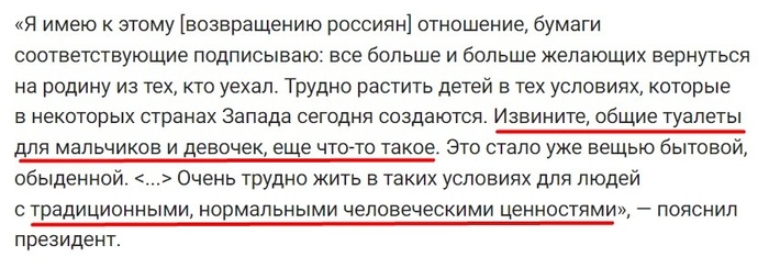 На этом фоне особенно пикантно звучат заявления о том, что российские эмигранты якобы возвращаются домой из-за гендерно-нейтральных туалетов в европейских школах. Получается интересная логика: лучше отправить ребенка в школу без канализации, чем в учебное заведение с современными, но "неправильными" санузлами. Видимо, отсутствие туалета вообще считается более нравственным, чем его неподходящее устройство.