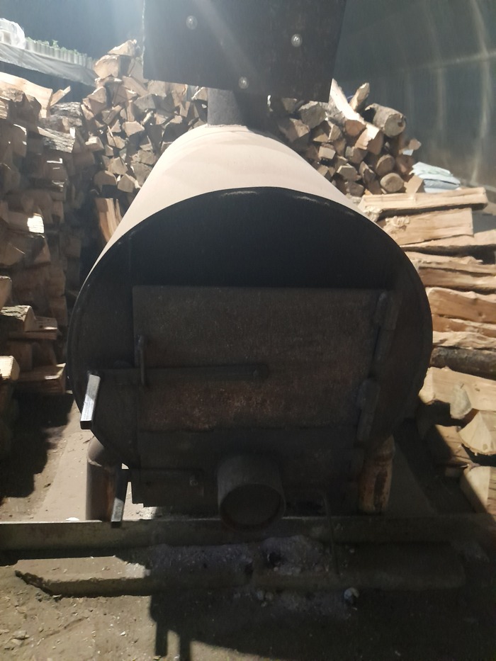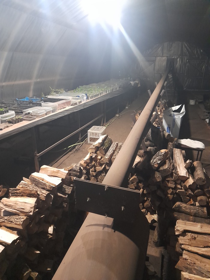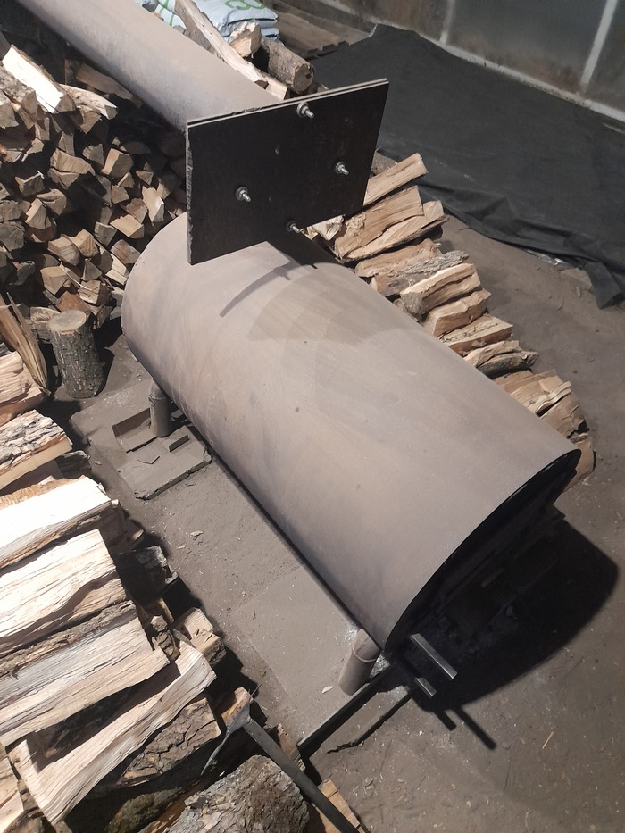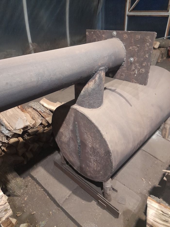 Многие также могут спросить, почему я топлю печь на колосниках вообще, а не подовым горение, тут так же существует множество споров и обсуждений, но конкретно в моем случае это скорее необходимость, чем желание, поскольку, как то так получается, а скорее не получается, заранее заготовить и высушить дрова, и их привозят пеньками за 2 недели до начала сезона топки (сколько их уходит, какие я беру, расскажу в отдельной записи), так вот подовое горение не катит, они либо не горят, либо горят и дымят, что не возможно открыть дверцу для последующей закладки дров, так же, как вы заметили, к основной бочке-печи у меня приварена 159 труба, толщиной 4,5 мм, длинной 14 м (почти во всю теплицу) так вот на колосниках, на сырах дровах, с регулировкой поддувала, можно так раздуть жар, что она практически вся, ну или если не вся, то метров 8-9 становятся просто красными, что соответственно облегчает и делает достаточным тепло для отопления данной теплицы. Ну и еще нуанс, при подовом горении, нужно постоянно тормошить дрова, чтоб они не закапывались в пепел, а когда их много, это соответственно напряжно, поэтому для меня это только колосники. Зимой когда за бортом -25, в нашей теплице возможно создать и +30, насколько часто нужно ходить и подкидывать, чтобы поддерживать такую температуру, вопрос сугубо индивидуален и зависит от многих факторов (чем покрыта теплица, поликарбонат или пленка, сколько мкр, какой толщины воздушная подука, что на полу, какой фундамент и т.д.), конкретно в моем случае при заданных параметрах выше, это походы каждый час. Всем спасибо за внимание, если что то упустил или не совсем корректно изложил, извините, это моя первая запись в таком виде изложения!