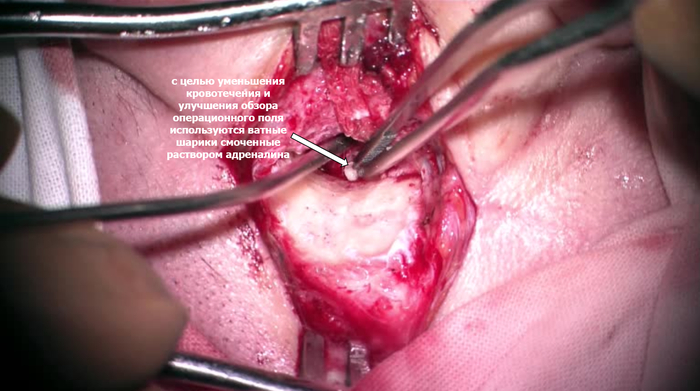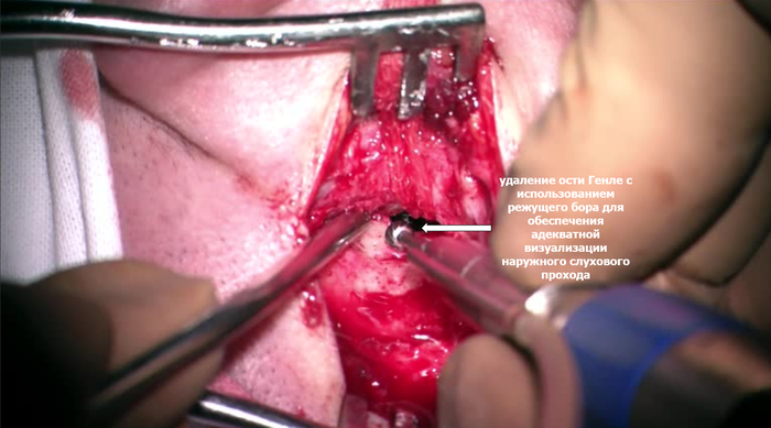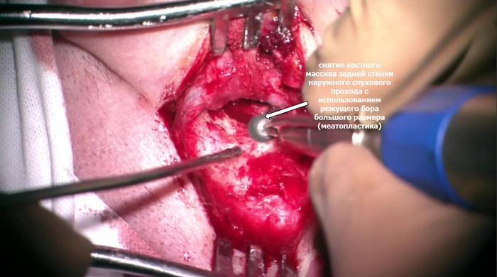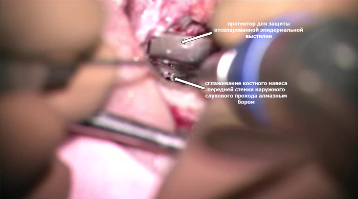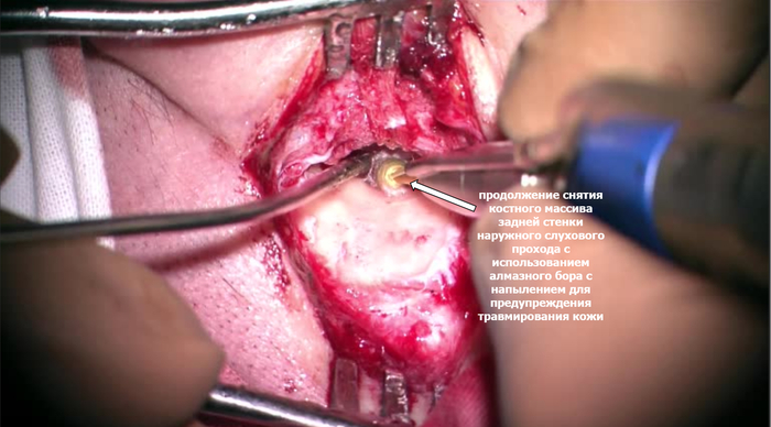 Следующим этапом мы убираем ориентир (ость Генле) и приступаем к отсепаровке кожи с использованием микронструментов и расширению наружного слухового прохода (меатопластика) с использованием режущих, алмазных с напылением и простых алмазных боров разных размеров. Цель сделать себе "удобно", а именно - хороший обзор. Если схематично, то цель из цилиндра наружного слухового прохода сделать подобие усеченного конуса. Данный пациент предательски кровил, поэтому закидываем ватные шарики с адреналином, чуть сушим поле, сепаруем (отслаиваем), пилим, повторяем...