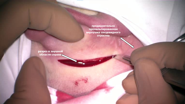 Операция проводится под эндотрахеальным наркозом, после того как пациента уложили обязательно совершаем ритуал подстройки стола-стула-головы пациенты под себя, чтобы поясница через пару часов не сказала "до свидания". Начинаем. Первым этапом разрез в заушной области. В данном случае правое ухо.