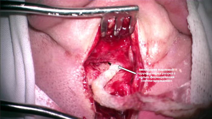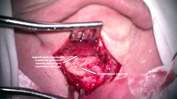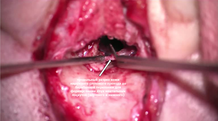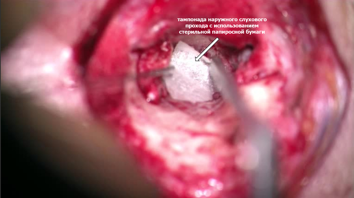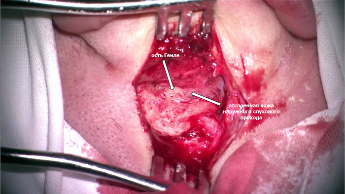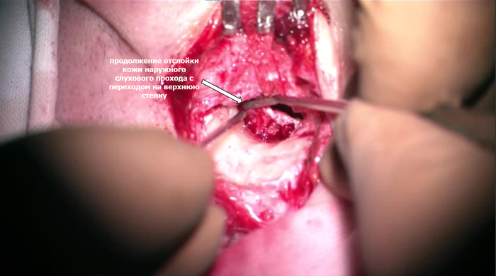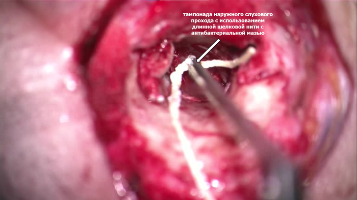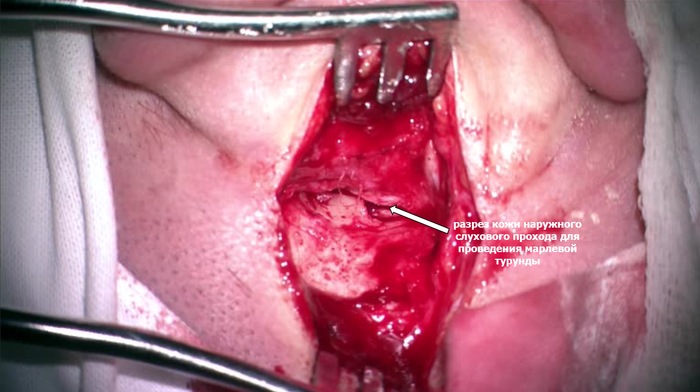 Дальше, как и всю операцию, делаем себе "удобно". На текущем этапе нам надо максимально широко визуализировать операционное поле, оттянуть мягкие ткани и сделать себе доступ в барабанной перепонке для ориентировки, чего мы и достигаем путем разреза кожи наружного слухового прохода и проведения через него марлевой держалки.