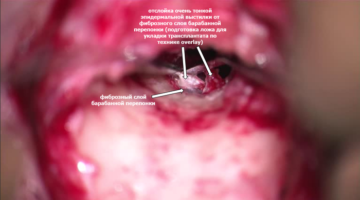 Мы дошли до барабанной перепонки, точнее до того, что от нее осталось (у нас же есть дефект, мы не просто находимся сейчас в операционной). Теперь нам надо подготовить ложе для укладки трансплантата. Мы будем готовить ложе по технике overlay, то есть отслаивать эпидермис от фиброзного слоя барабанной перепонки. Если схематично, то задача поднять кожу в виде носка наружу с дыркой на пятке (дефект барабанной перепонки который привел нас в операционную) до оголения костного отдела наружного слухового прохода, прилежащего к барабанной перепонке, так как укладку трансплантата будем осуществлять на кость. Данный пациент отличался чрезвычайно тонкой кожей, отчего работа была с меньшим удовольствием, а также с большими потерями (предательски улетали в аспиратор). Это не плохо, так случается, главное минимизировать потери.
