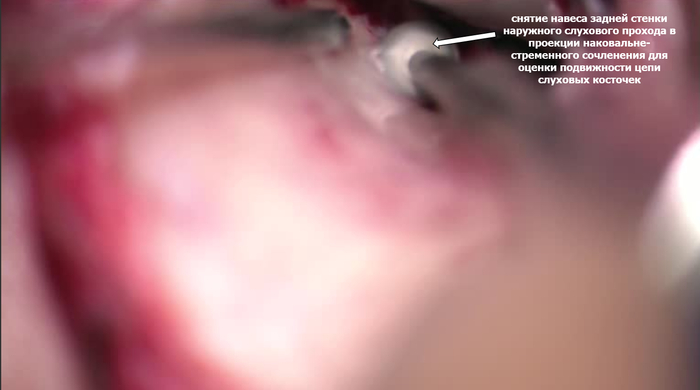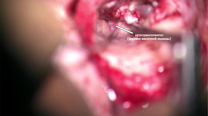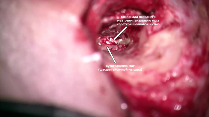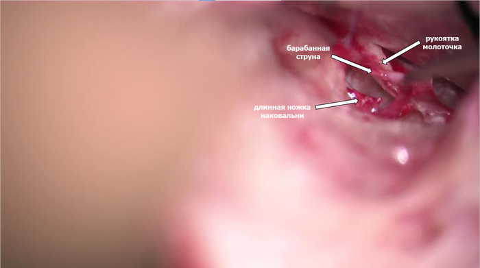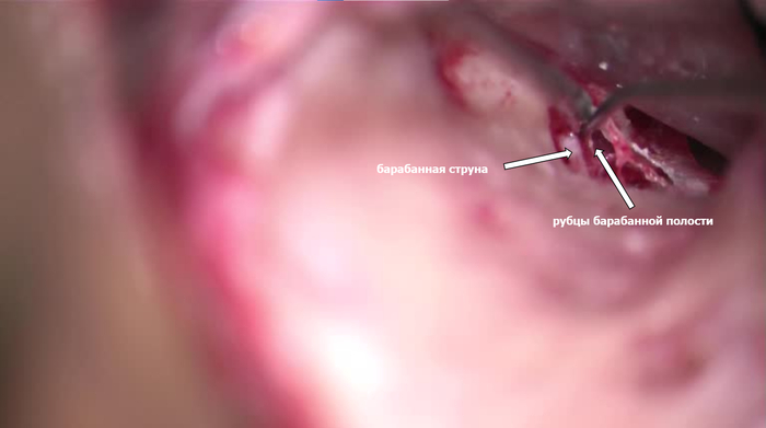 Мы все подготовили, однако надо провести ревизию барабанной полости. У пациента не сильно снижен слух, по КТ височных костей тоже все чисто, так что большого смысла это не несло, однако на операции в моей голове очень часто мельтешит фраза: не пытайся договориться с собой. В данном случае несмотря на низкую вероятность патологического процесса в среднем ухе все же выполняем тимпанотомию (заход в барабанную полость). Оцениваем подвижность цепи слуховых косточек, поэтому заходим в области задне-верхнего квадранта (проекция слуховых косточек). На пути у нас барабанная струна (вкусовая ветка VII пары ЧМН, отвечает за вкус на передних 2/3 языка), стараемся не повредить. Зашли не зря, видим рубцы, иссекаем, все еще довольны работой.