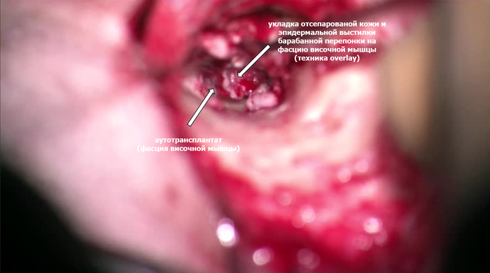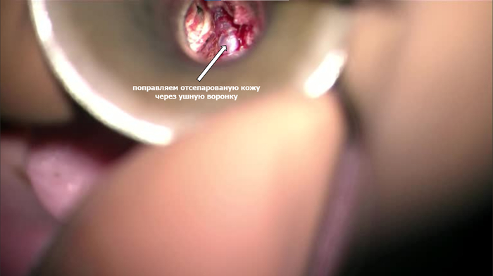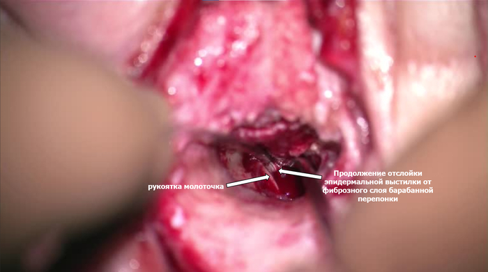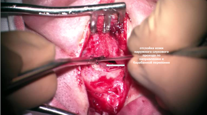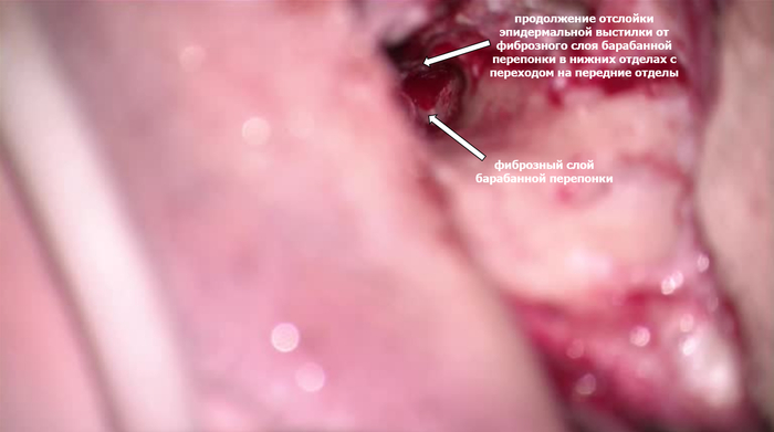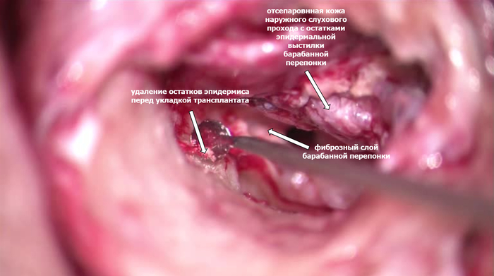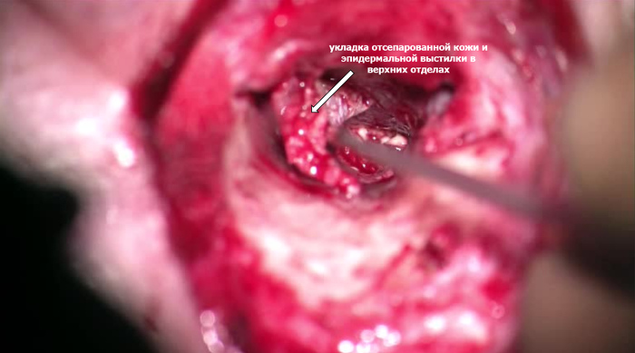 Подготовительный этап к укладке трансплантата почти закончен, осталось собрать остатки эпидермиса для предупреждения формирования ятрогенных холестеатом.